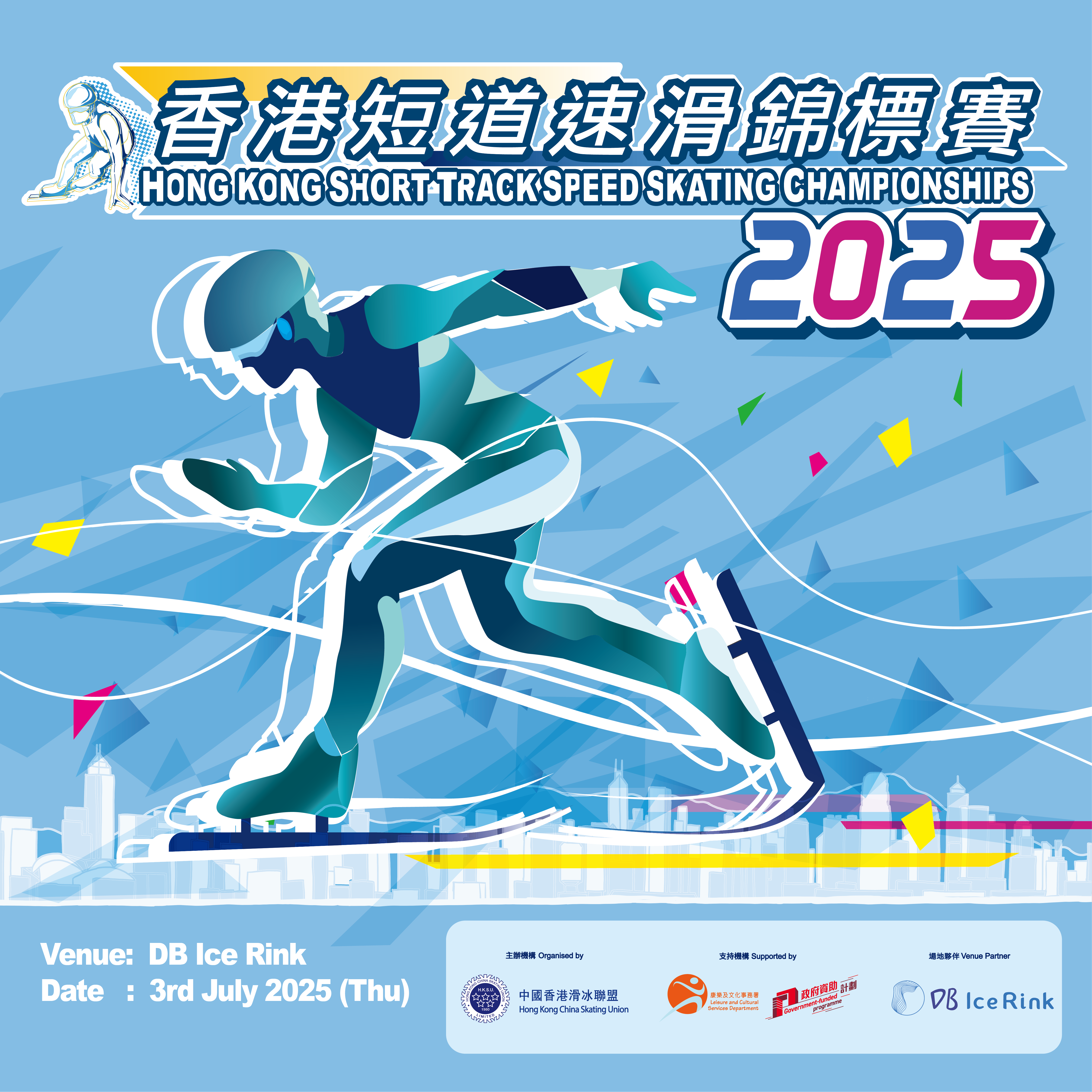 【二零二五年六月二十七日】由中國香港滑冰聯盟主辦的「2025香港短道速滑錦標賽」,將於7月3日在愉景灣溜冰場隆重舉行。此次比賽獲得政府文體旅計劃資助,並由康樂及文化事務署全力支持,愉景灣溜冰場則提供場地贊助。我們誠摯邀請各媒體朋友派員親臨現場,見證本地滑冰精英的非凡表現。